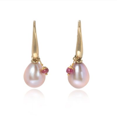 A beautiful contemporary pair of Pearl earrings with an 18ct yellow gold elongated wire fitting and two pear shaped pale pink Pearl drops. There are also two small round faceted Ruby beads dangling from the wire fitting.