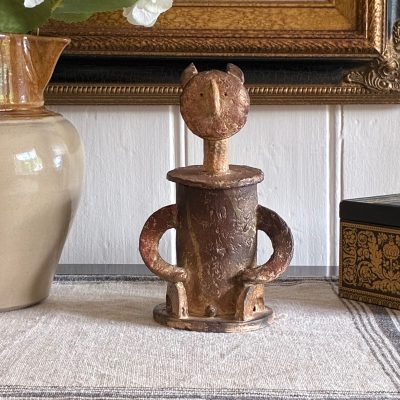 This faintly arcane piece is made from a variety of clays mixed together and the resulting variations and imperfections plus an open firing over wood have given a subtle patination to the surface.