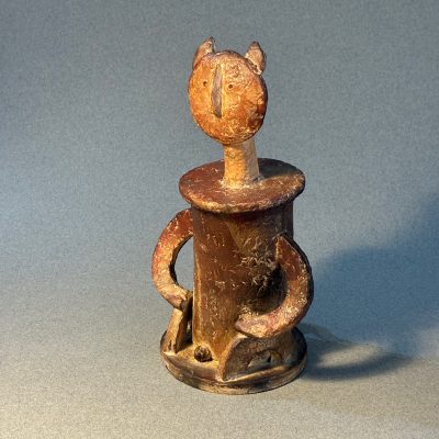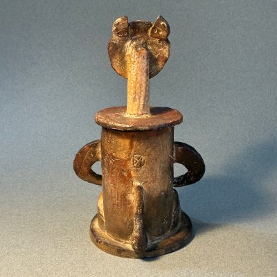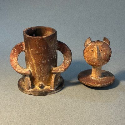 A lidded vessel: An unglazed faintly ritualistic earthenware vessel with a hint of tribal protective magic.
