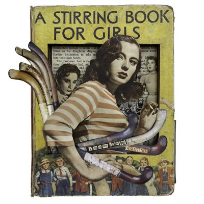 ‘Face Books’ are 3-D collaged artworks using found ephemera in original books with a witty take on social media.