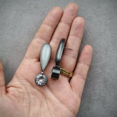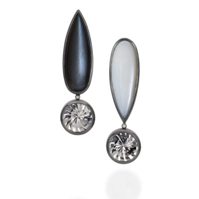 Featuring white & grey moonstone, spiral cut rock crystal and diamond, set in oxidised silver.