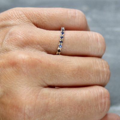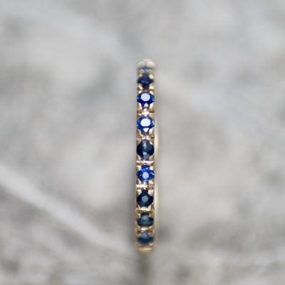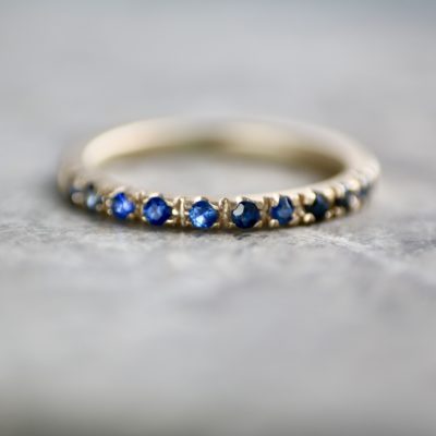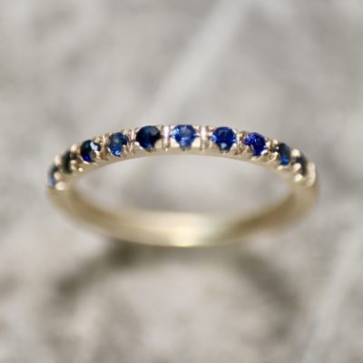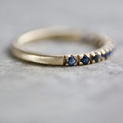 A row of natural blue sapphires, pavé set on a brushed gold band. This half eternity ring is made from scratch in the workshop from solid, 100% recycled 9ct yellow gold & set with ten 1.5mm round faceted sapphires.