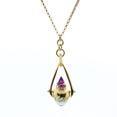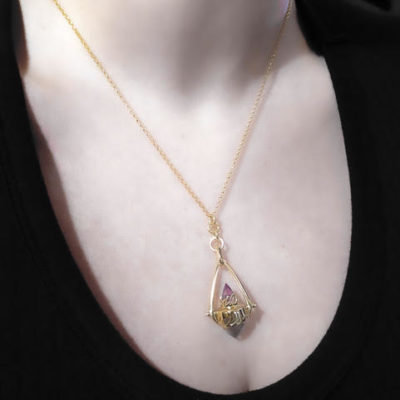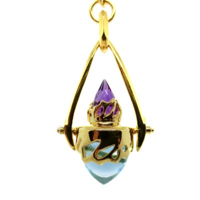This gorgeous blue topaz & violet amethyst pendant is handmade in silver with the unique asymmetrical setting in the Odette jewellery style and finished with gold plating to illuminate the opulent hues of the natural stones.