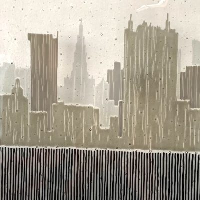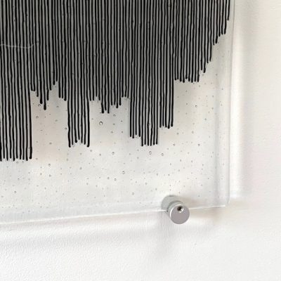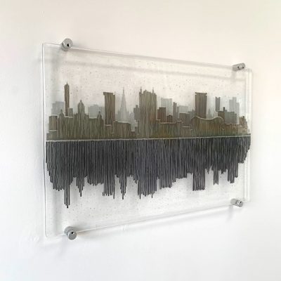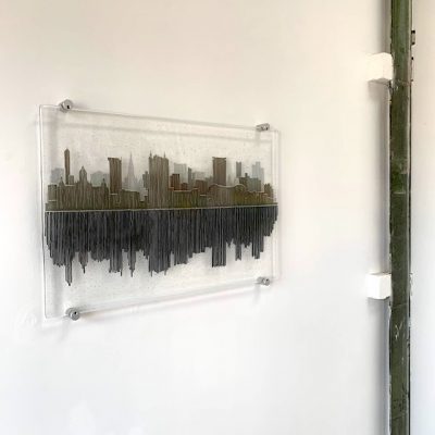 Four contemporary fixtures are included, showcasing the glass 20mm from the wall. This artwork lets transmitted light and shadows onto the wall behind, making this an integral part of the piece. At night when there is no natural light, the buildings become more 3D and have more depth.