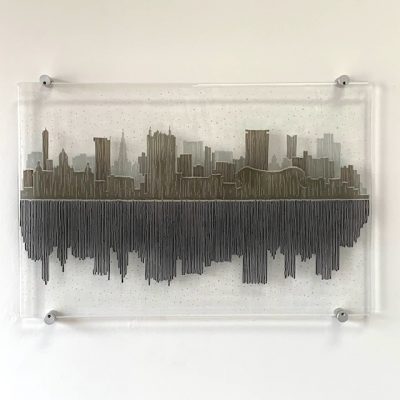 This stunning handmade wall panel of the Birmingham (UK) skyline is created with ‘Bullseye’ glass sheets and 1mm glass stringers (rods). It features some of the cities most iconic architecture, such as Saint Martins church and Selfridges, mixing the old with the new.