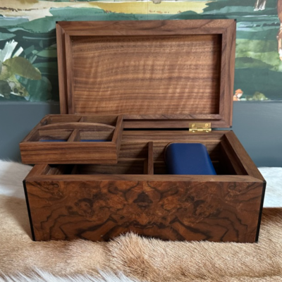 The box was designed to be a stunning yet functional showpiece, exhibiting just how beautiful Burr Walnut is. The four way book match pattern exploding from the center of the lid to create a wonderful kaleidoscope effect