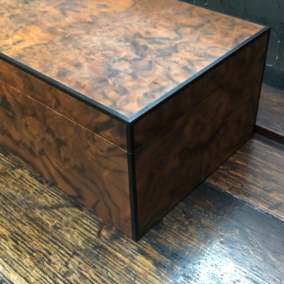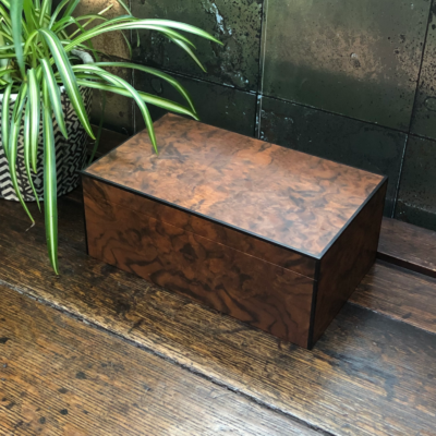 Made from Book-matched Burr Walnut with black Ebony inlay edges. The Burr Walnut veneer is hand cut and individually matched by an expert maker to create a beautiful, individual finished piece. The interior lined with a leather or fabric of the clients choosing to provide a luxurious and functional storage space.