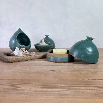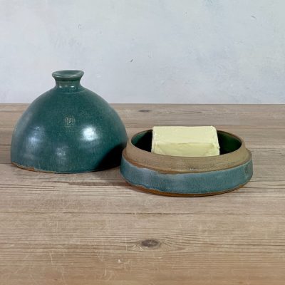 Wheelthrown butter dish in a toasty stoneware clay and finished in teal silky glaze – or duck egg blue or new smooth stone – so great for half a pack of butter – keeps the butter fresh with easy access for cooking or spreading. Can be ordered in different finishes. Also available in matching salt pig, and garlic keeper and lemon juicer.