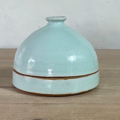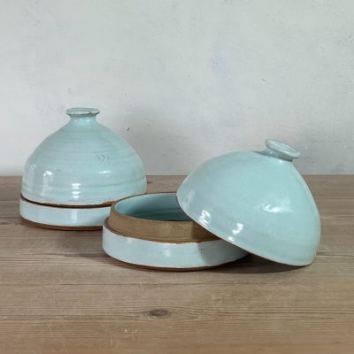 This design has been refined – the piece is thrown as one hollow form – then a gallery for the lid is created by indenting the clay with a wooden tool -the lid and base are divided but then fired together. The gallery ensures that the lid fits cleanly over the butter without touching it. It’s simple and practical and a great addition to a busy cook’s kitchen. These are a new and slightly larger version approx 13 cmsø and approx 13 cms high – great for 1/2 a pack of butter
