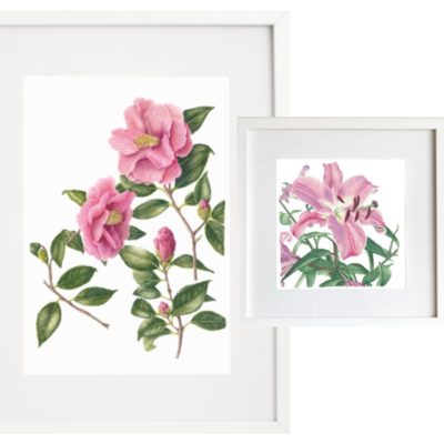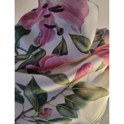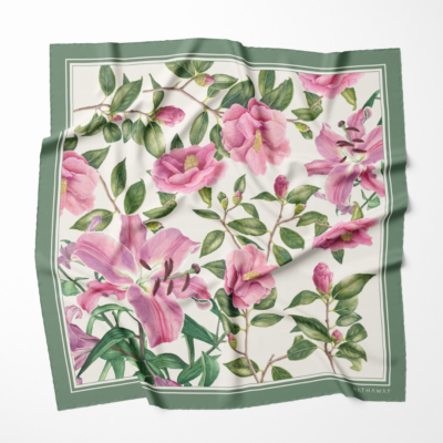 Scarf design created from two of Lyn Hathaway’s original hand-painted botanical artworks, printed on a pure silk twill