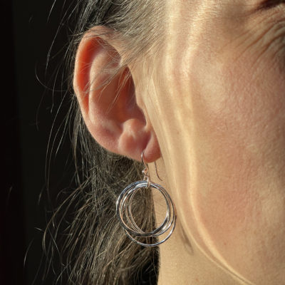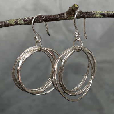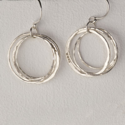 Circle Earrings Medium are made from recycled silver and also available in 9ct gold. Made with interconnected hoops of silver wire, with a hammered texture and handmade ear wire. They catch the light beautifully when you wear them. Good for everyday wear (medium size) also look stunning for when you are going out. Very comfortable to wear. Hallmarked.