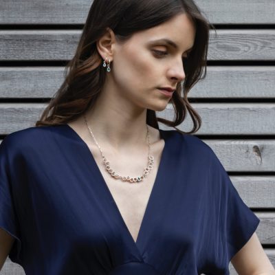 This is hot off the press this autumn 2021. I have a similar design but with squares, but have always loved a tear drop stone and hence the reason for doing this necklace with these shapes. I love the randomness of the drop shapes together and the addition of a handset stone gives it a little more interest. Earrings to match available