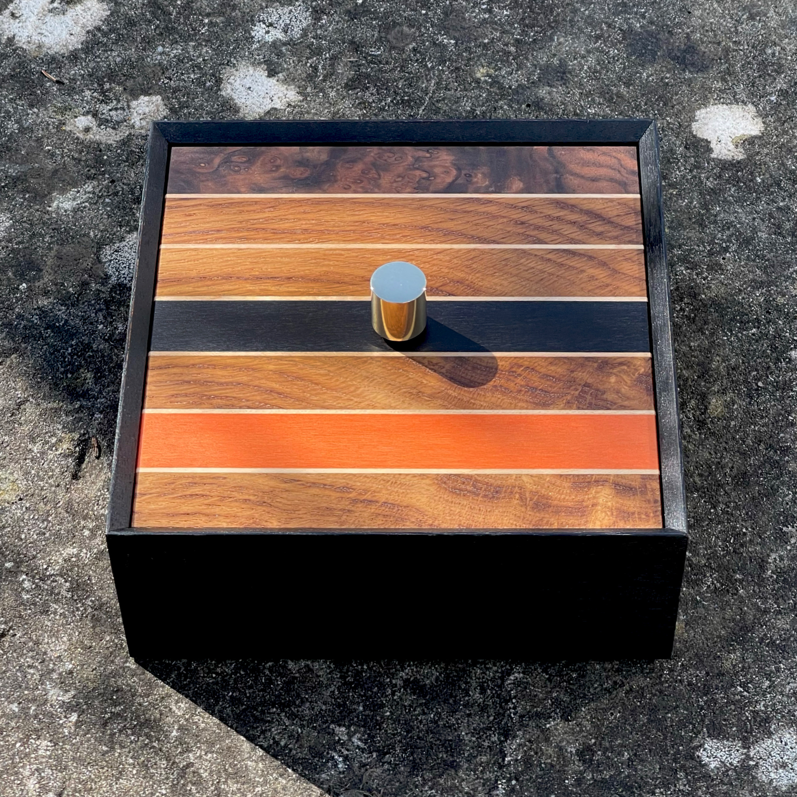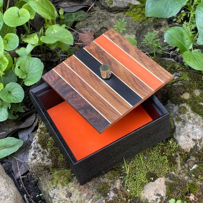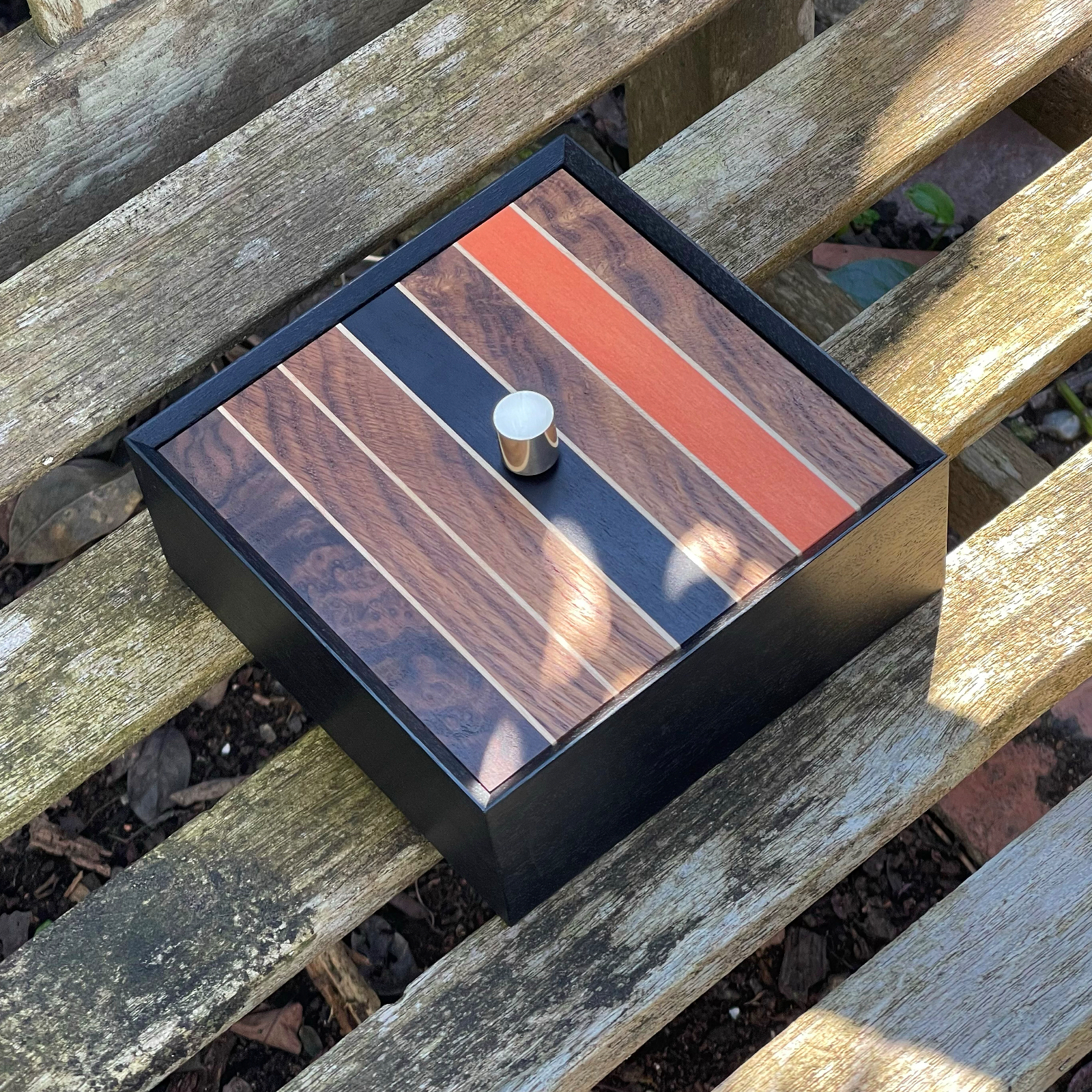 This box is made from solid ebonised sapele and measures W150mm x D150mm x H60mm. The base of the interior is lined with tangerine orange suede.