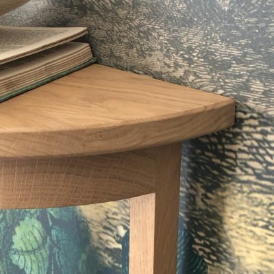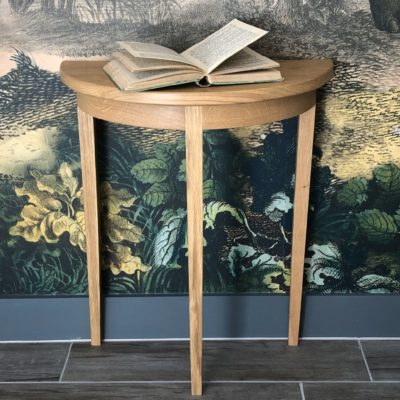 This charming demilune side table combines elegance with functionality, featuring graceful arched side rails and tapered legs. Its sleek design fits effortlessly against any wall, making it an ideal accent piece for tight spaces. The delicate chamfer around the top adds a refined finishing touch. The timber is hand selected to make sure a beautiful grain is featured throughout the table.