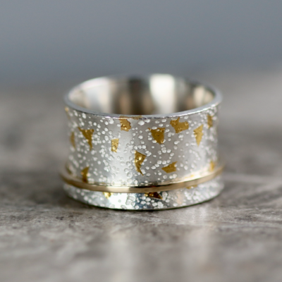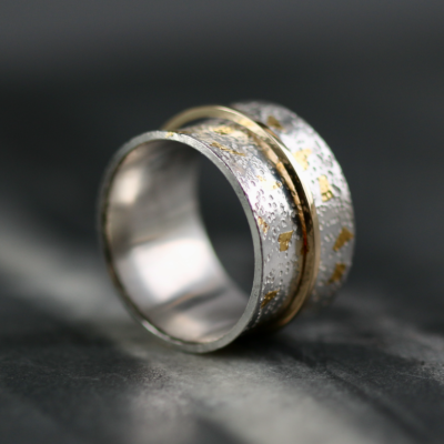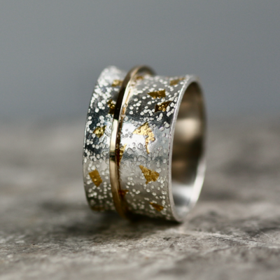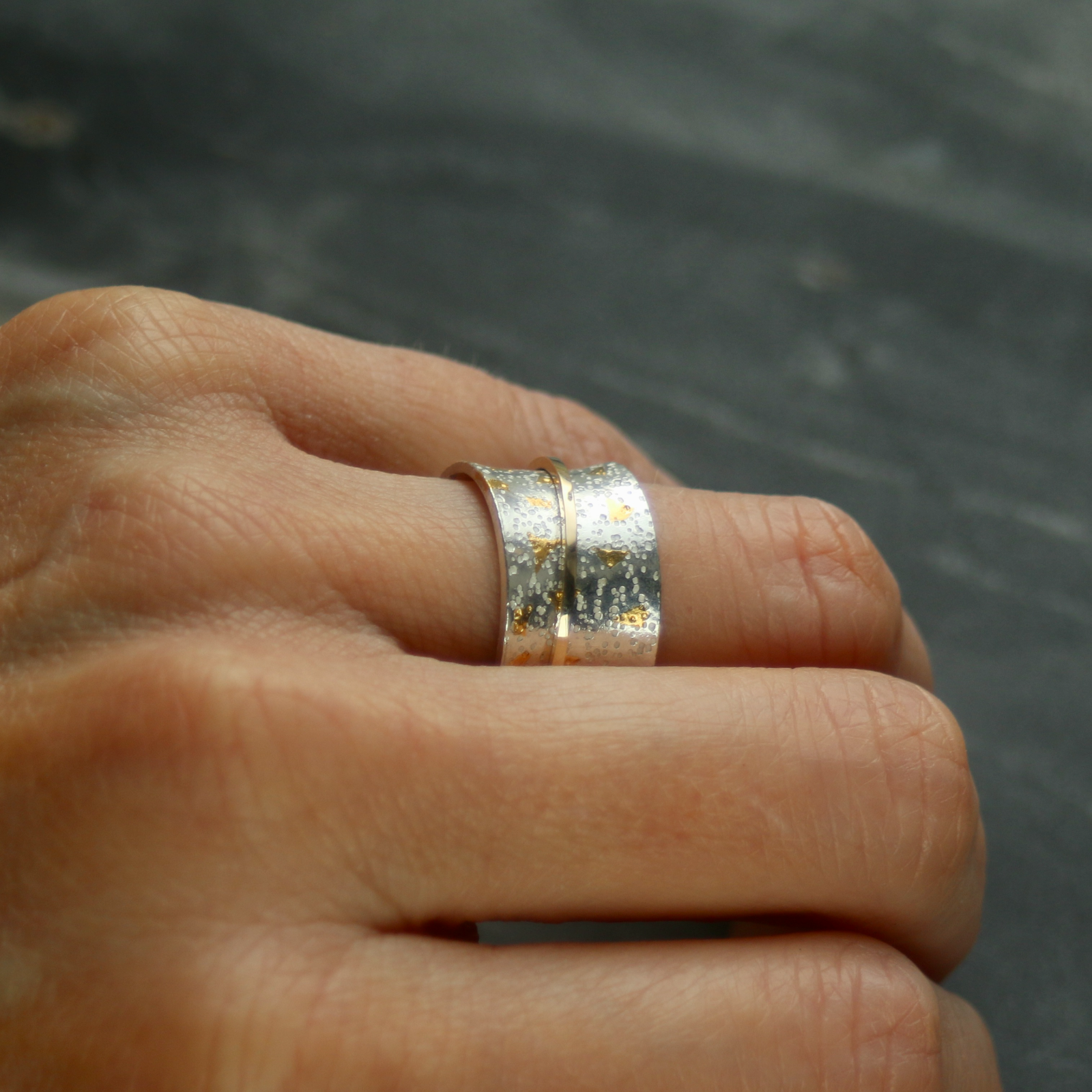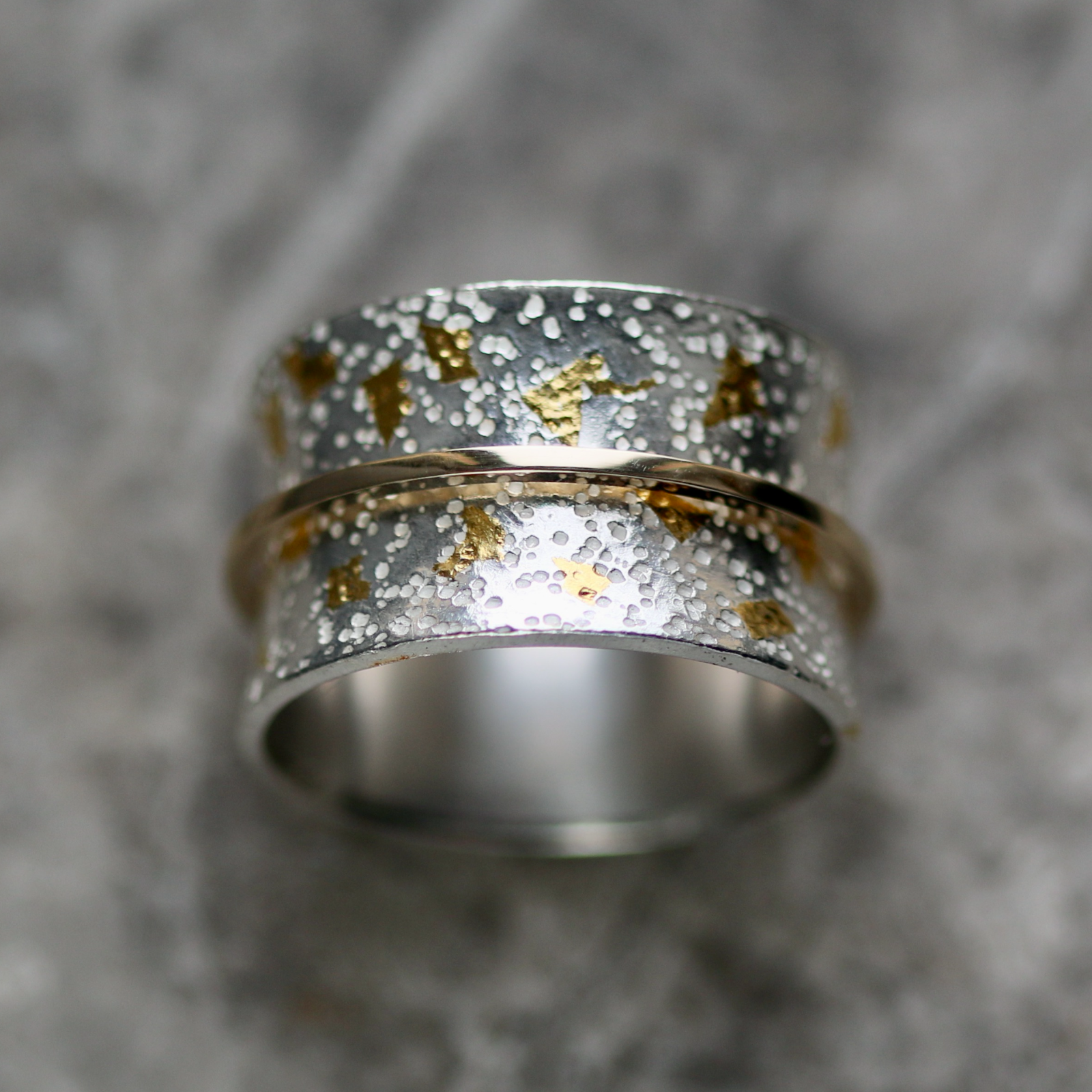 Consisting of two rings, the wide concave band is textured on the outside, to give a dotted finish, with a scattering of pure 24ct gold elements that goes all around the band. The ancient technique of Keum Boo (meaning ‘applied gold’) is used to permanently apply & bond the fine layer of pure gold to the surface of the ring, using only heat & pressure. The bond is permanent & the gold used is around 10 times thicker than gold-plating. Around the wide band is a separate, spinning, solid, recycled, 9ct gold band, polished to a high shine.