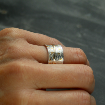 Wide Silver Band: 100% recycled, solid sterling silver, approx 12mm wide, approx 1mm thick. 23.5ct Gold highlight scattered all the way around the outside.