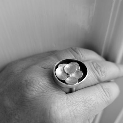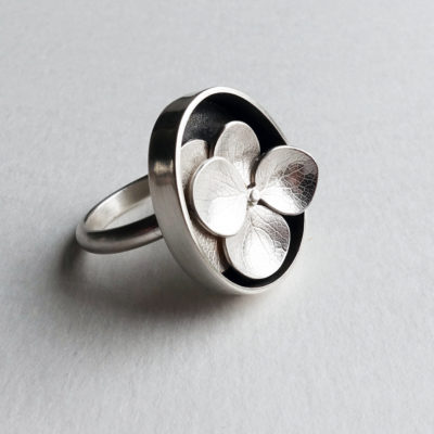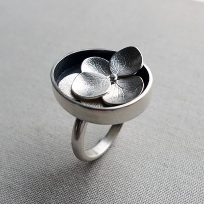 This ring features a secret garden full of hydrangea blooms. Each flower is hand fabricated using silver imprinted with dried hydrangea flowers to create a unique tiny arrangement, consequently no two rings will be exactly the same. Please contact us with your ring size when ordering.