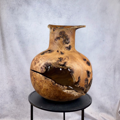 This vase is made from a large elm burl. It was made by mounting the wood to a traditional wood lathe and turning it off-centre. The natural edge of the burl gives the vase the look that something is missing or broken away. I hope that this gives the vase the look of an Ancient Egyptian Vase that has just been excavated. I have always had an interest in history and I hope this comes through in this piece. The vase is all handmade and I have used an additional woodturning tool to slow carve away pieces, in the hope that the vase looks completely different from different angles and perspectives. If you are interested in seeing the different stages in this piece being made, this sculpture is 23inch or 58cm height and the width 17inch or 43cm