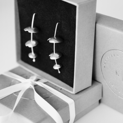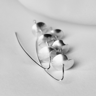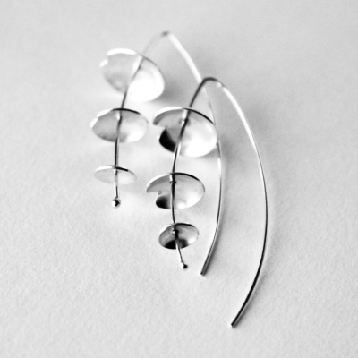 Drop earrings celebrating domed euphorbia floral leaves, growing from a central stem. Three Silver cupped leaves decreasing in size are joined together by a curved silver stem.
