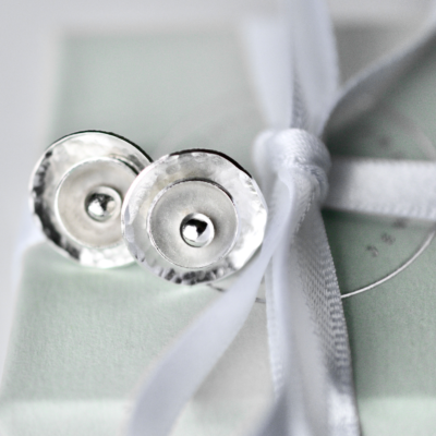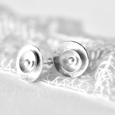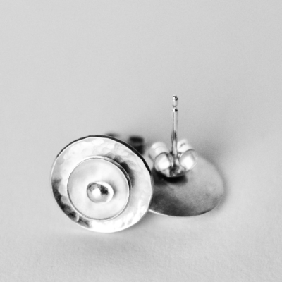 Double layered, highly polished domed structure with argentium unicorn stamp. 13mm diameter stud earrings with sterling silver butterfly fittings. The outer dome is hammer patterned; the inner dome contains a simple silver seed.