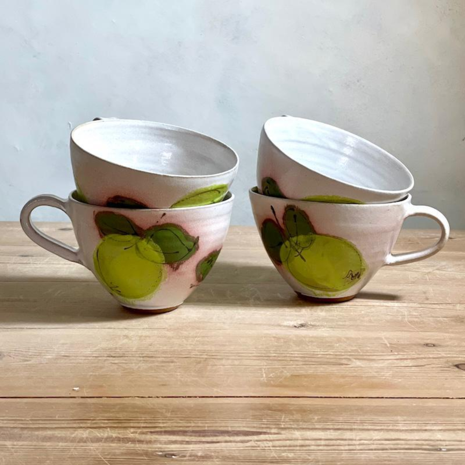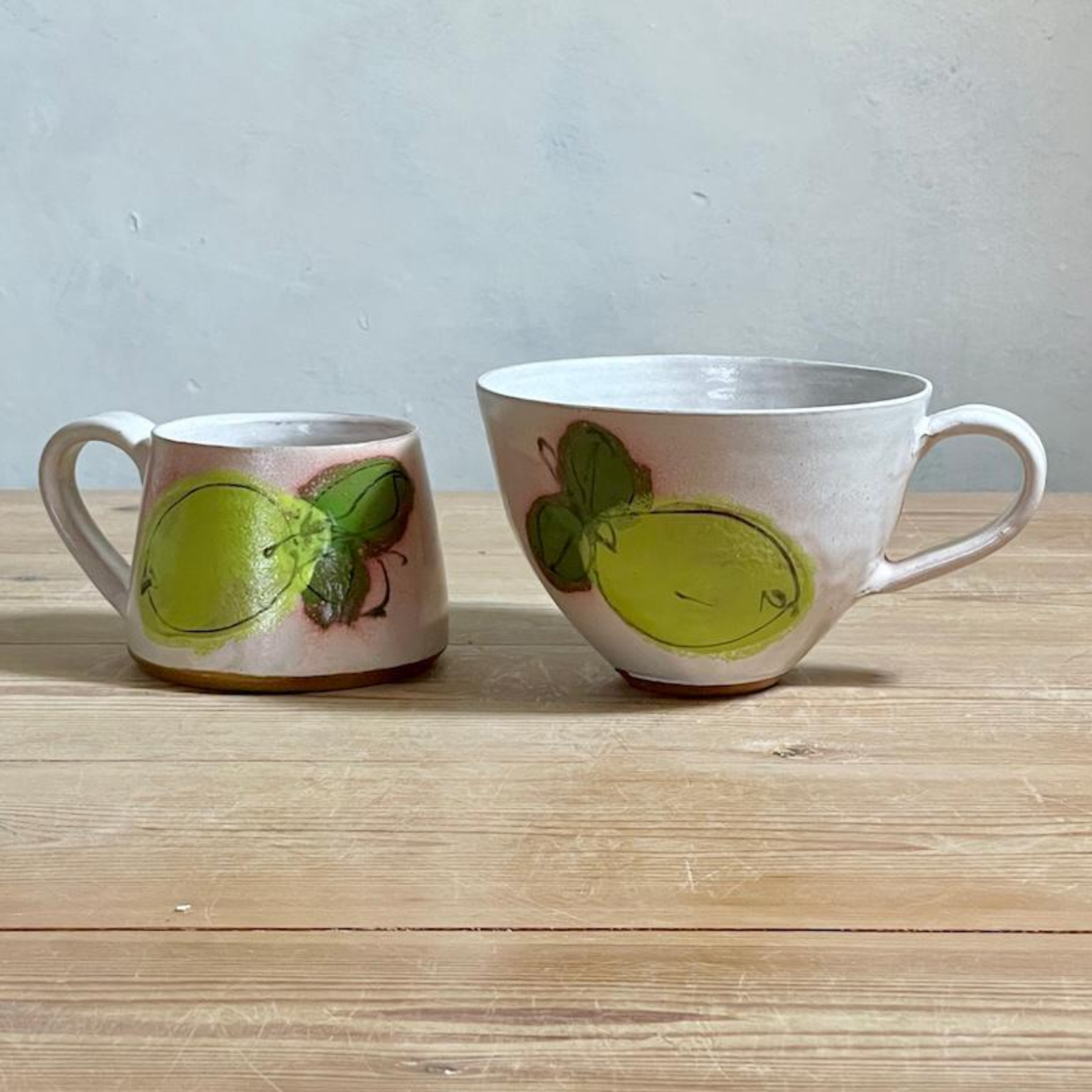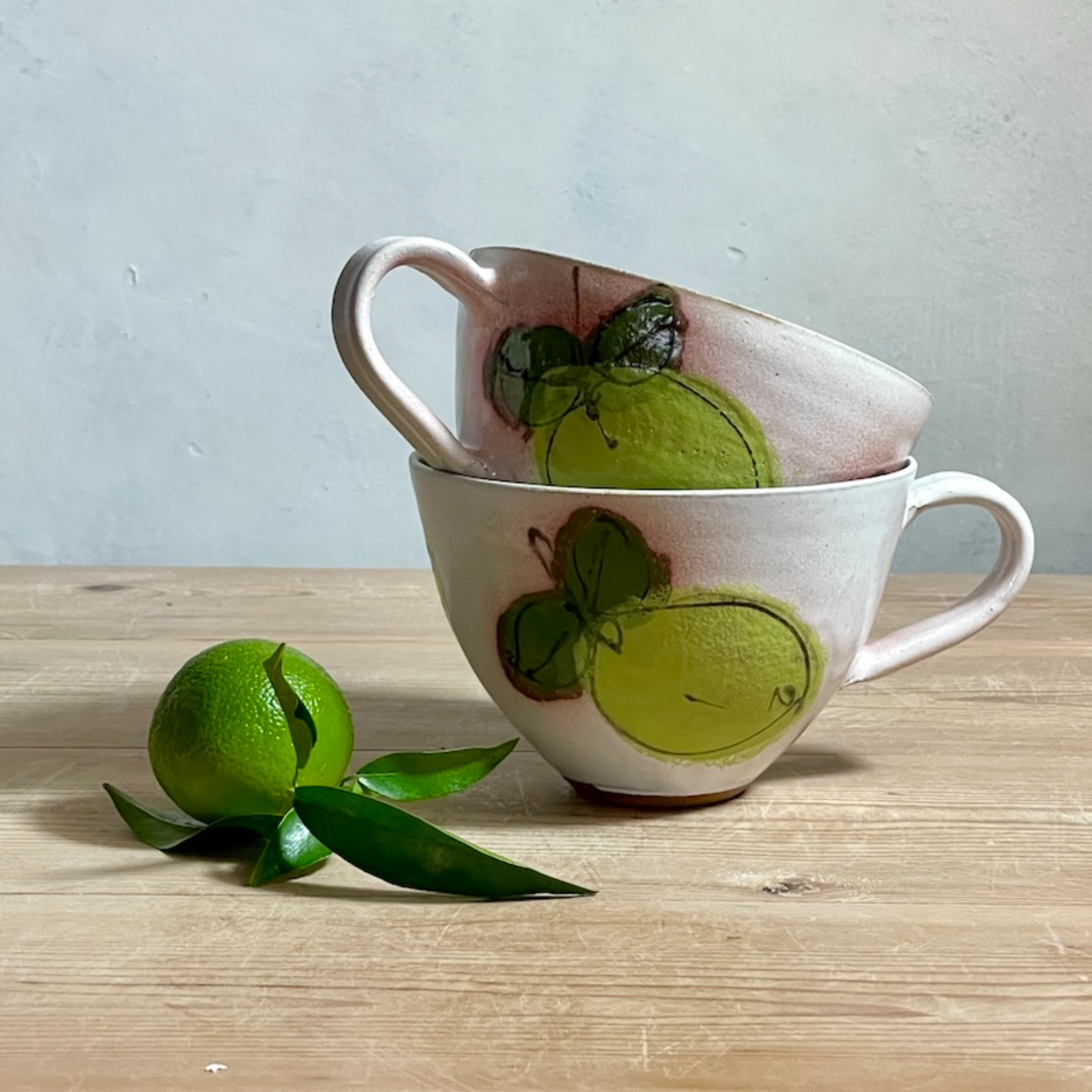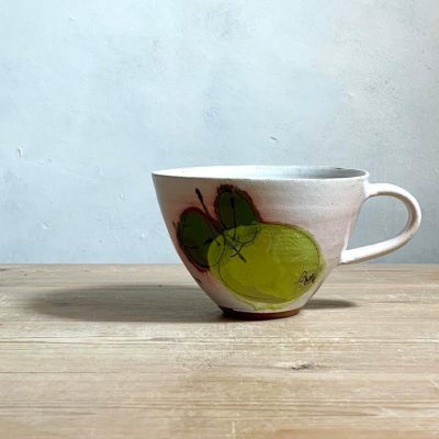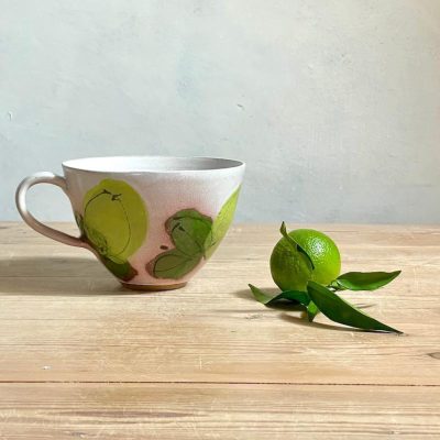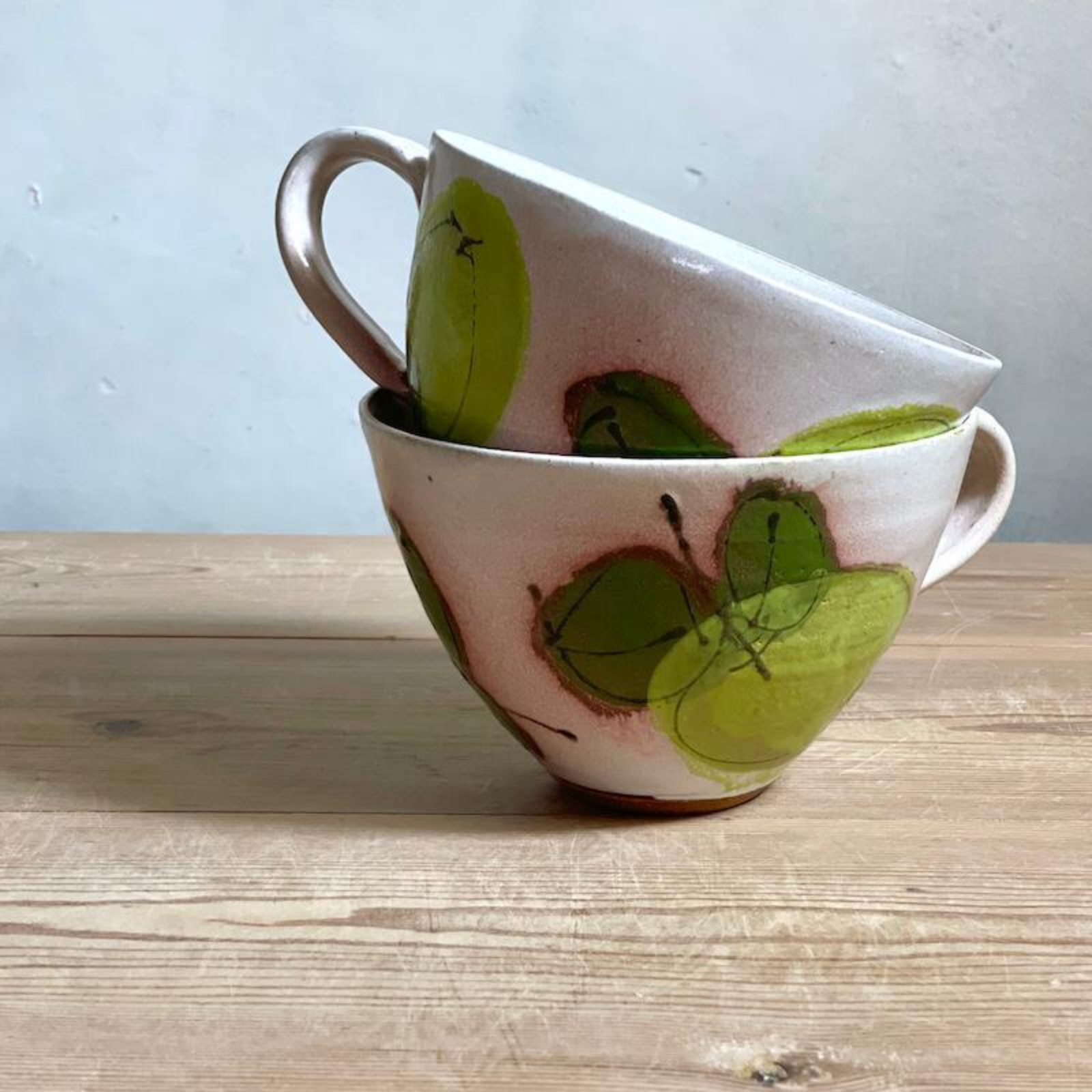 Wheelthrown extra large cup in toasty stoneware, 3/4 glazed in chun silky glaze on the exterior with lime and leaf decoration – fully glazed plain interior