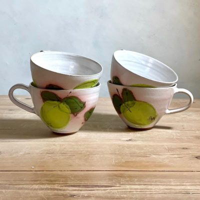 The fruity pieces are fun to make: – drawing the fine lines of fruit and leaves with a slip trailer and painting on the glazes. I love the freedom of drawing on the pot in this way – and allowing the kiln to do its work – so the fruit stalks and leaves blend with the flowing glaze and create a unique image – no two will be the same