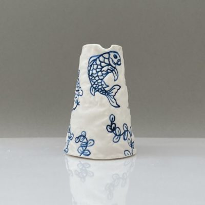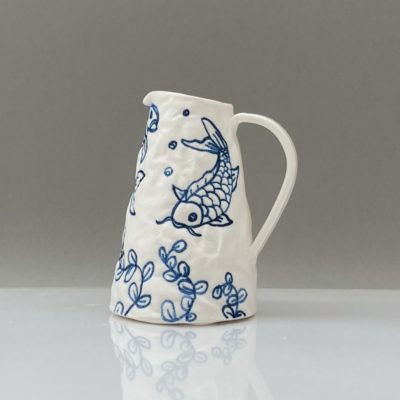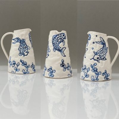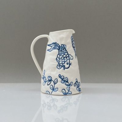 This porcelain jug has the textile texture of three machine embroidered carp swimming amongst flowing aquatics. The stitches are overpainted at the bisque stage with cobalt and fired to give a rich blue. The interior and handle have a glossy transparent glaze and there are three sprigged buttons on the base. The jug is functional and can go in the dishwasher.