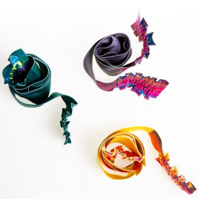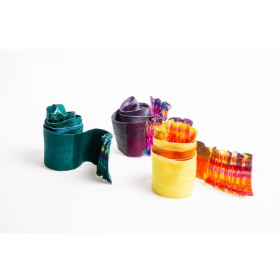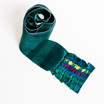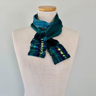 Hand printed pleated cravat scarf in spun poly fleece with bold contrasting colours