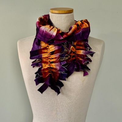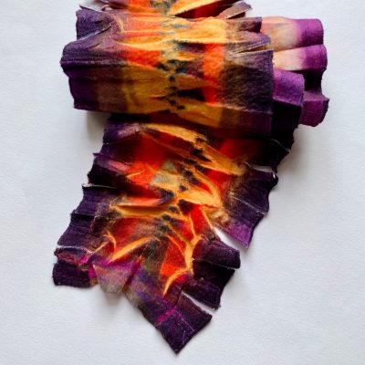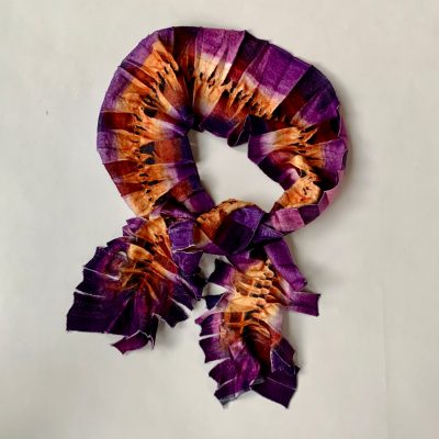 My work is inspired by colour, texture and light in the natural environment. My unique tactile collection of individually hand printed and pleated scarves and wraps span a range of mixed fibre fabrics and are all hand washable and permanently pleated.