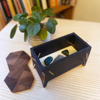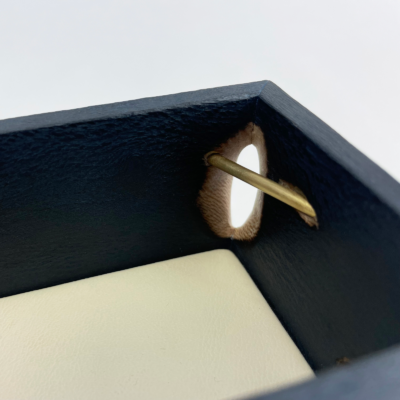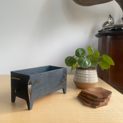 An exploration into fragility, this piece was driven by the process. The piece utilises a finish for the london plane, which involved a blue dye and scorching. A simple casket design was created, then scorched to corrupt its form, the damaged area taken as a cue for further shaping. After the sculptural form was resolved, some additional brass splints were used to support the structure, overtly signally a weakness but also a beauty in its boldness. Built from london plane, brass and leather.