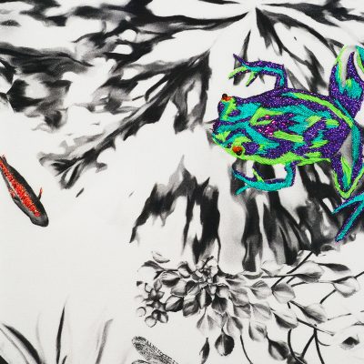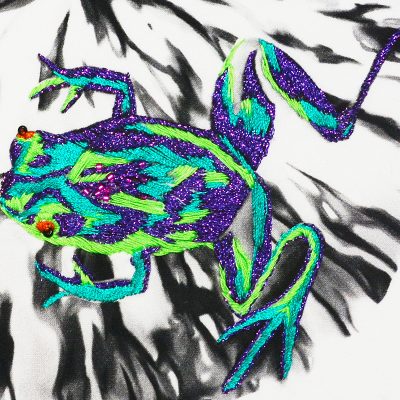 This is a one-of-a-kind contemporary piece by hand embroidery artist Susannah Weiland. She has embellished her pencil drawn illustration with bright highlights of hand embroidery and beading in her Richmond upon Thames studio. Glass framed and ready to hang.