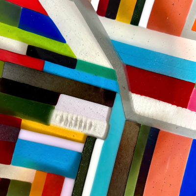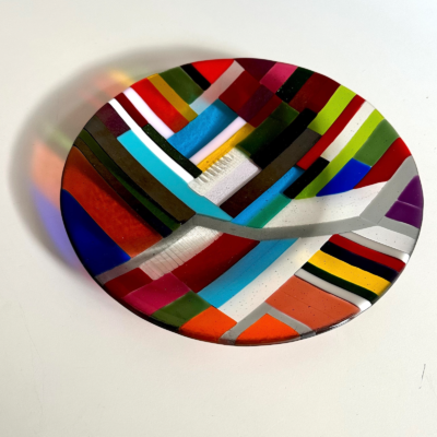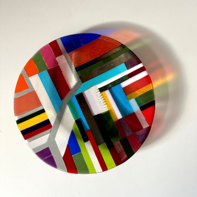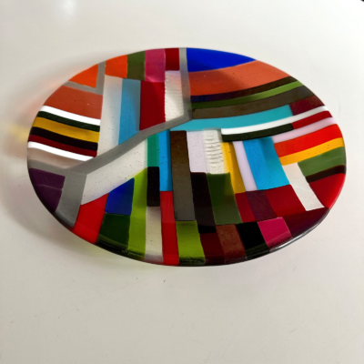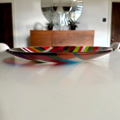This handmade fused glass artwork is inspired by satellite imagery of tulip fields in Amsterdam.