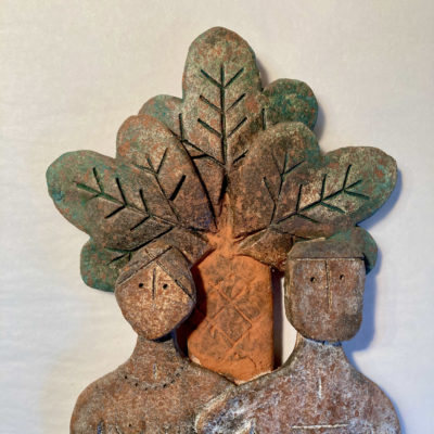 “I work with a variety of clays into which I often add other fragments of material. These ”inclusions” plus the use of oxides and multiple firings add to the alchemy and often give the clay a distressed or patinated surface.”