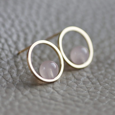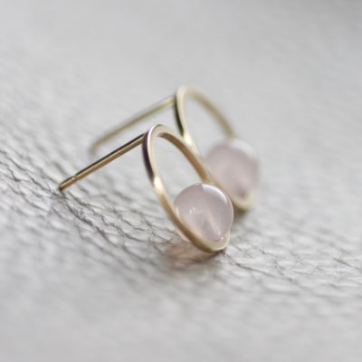 Truly the easiest to wear & one of the most flattering pair of earrings you’ll own. The romantic combination of pink and gold. A pair of solid 9ct gold stud hoops handmade & polished to a high shine, featuring a semi-precious rose quartz stone that ‘floats’ within. Rose Quartz is a natural mineral, very pale pink in colour and translucent.