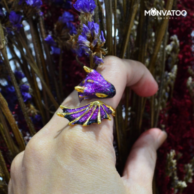 This gold amethyst dragon ring is handcrafted from 24ct gold plated over solid brass and enamelled. It has an adjustable ring band so will fit comfortably on any finger.