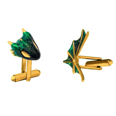 These gold emerald dragon cufflinks feature one elegant green emerald dragon head and one dragon wing on each side of the pair. They are great statement pieces for suits.
