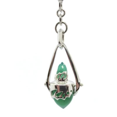 Gorgeous in polished silver, the stones are a luminous green agates, a faceted bullet cut stone that contrasts beautifully with the larger polished stone for an opulent visual treat.