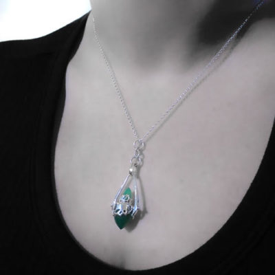 The Handmade setting has an asymmetrical organic flow around the stone designed to represent the delicacy of an insects wing, and hung on an 18″inch chain.