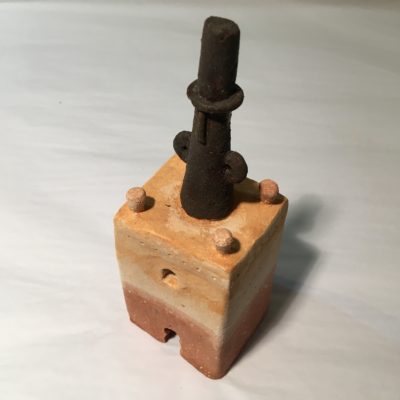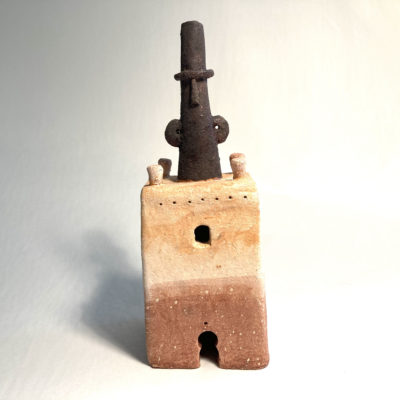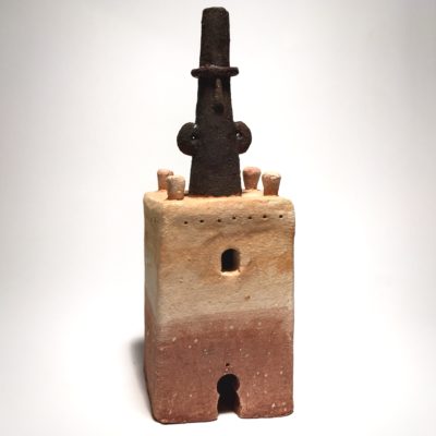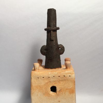A top hatted figure finished in black oxide stands on top of a Moroccan style earthenware tower.