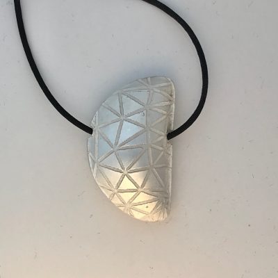 This is a press formed piece carried on a black cord with tiny sterling silver end caps. The half moon shape comprises a cushion form which has been etched with an abstract design.