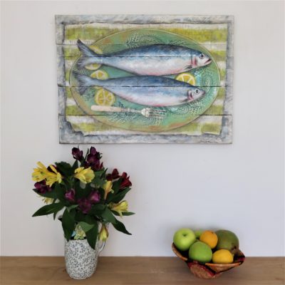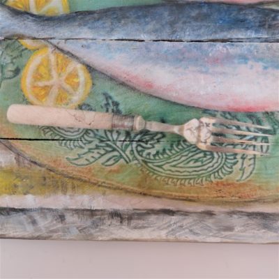 Hand Embellished Wood Panel Print – Two Herrings and Lemon DTW29