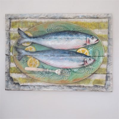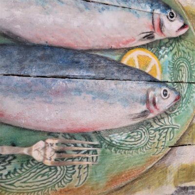 My ‘still life from the kitchen table’ wood panels are inspired by fresh fish , fruit and vegetables waiting to be prepared for supper. Herrings are beautifully coloured fish with silvery iridescent sides and blue metallic hued backs , found in North Pacific, North Atlantic Ocean and Baltic sea. I’ve seen them in local fish markets in Scandinavia and northern Europe and always attracted to their silvery bodies!