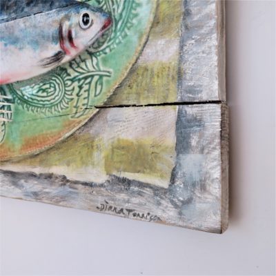 This hand embellished wood panel print is a high quality photographic image of one of my still life ceramic and wood sculptural artworks, inspired by colourful fresh fish waiting to be prepared for a tasty supper. This wood panel is handmade using reclaimed wood and then expertly digitally printed onto the surface, penetrating the indentations of the wood grain and textures. After printing I hand embellish using acrylic paint where necessary to enhance the colour or definition. Finally, a clear matt varnish is applied.