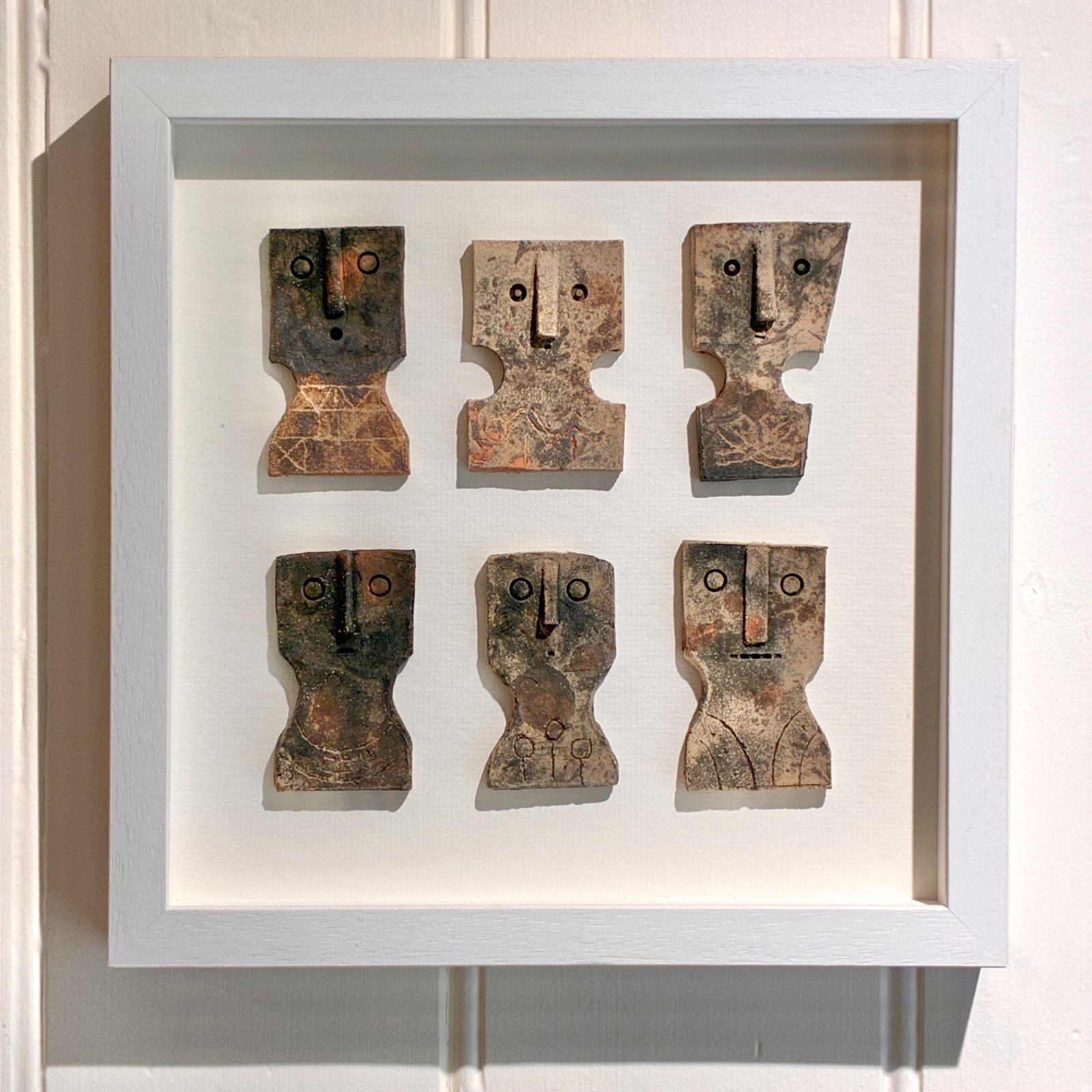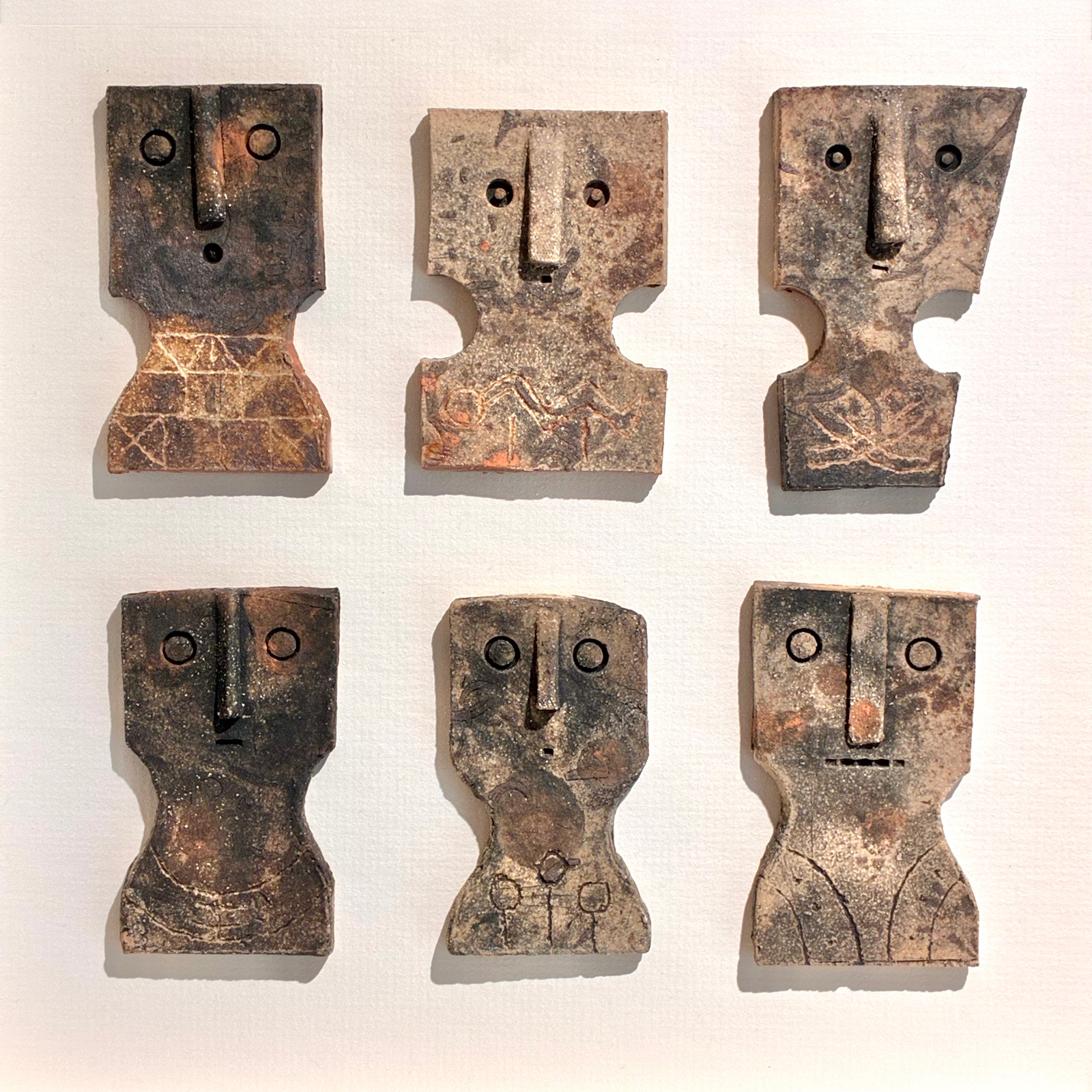 A set of six ceramic faces mounted on an ivory board with a wired finish. Each face is made from a mix of clays that is rolled flat, cut to shape and decorated with incised markings. After the initial firing they have oxide colours between two more firings