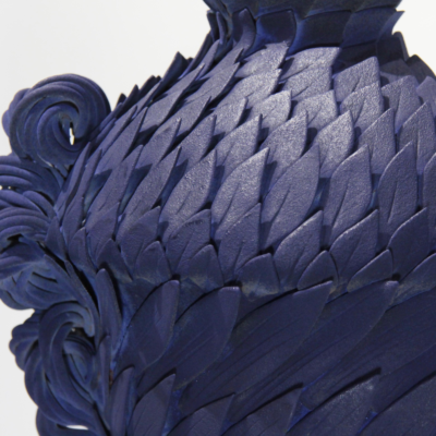 Terracotta clay. Part thrown on the potter’s wheel and part coiled built. The leaves are applied individually. The the glaze is hand made also with barium and cobalt to achieve a volcanic finish. The piece is approximately 60cm H x 40cm W and variable.