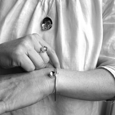 Hydrangea petals look fragile but are amazingly strong. The petals are selected after the flowers have dried out and survived all the weather that autumn and winter can throw at them. These petals imprint into annealed silver in an incredibly detailed way. Each flower bud is ‘planted’ into a silver cup which stops the petals getting caught on clothing.