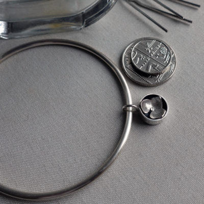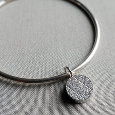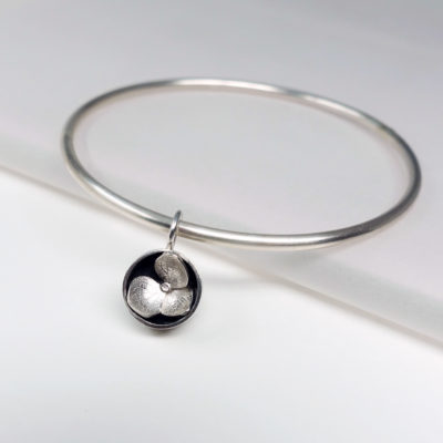 This bangle features a single hydrangea bud. Each bud is hand fabricated using silver imprinted with dried hydrangea flowers to create a unique tiny arrangement, consequently no two bangles will be exactly the same. The back of the hydrangea bud charm is imprinted with a leaf texture. The bangle is made from solid sterling silver wire which is 2.5mm in diameter. The bangles come in three sizes: 6cm, 6.5cm and 7.5cm. If you need a different size please contact us.