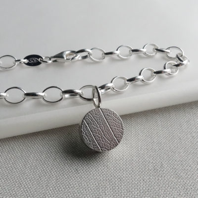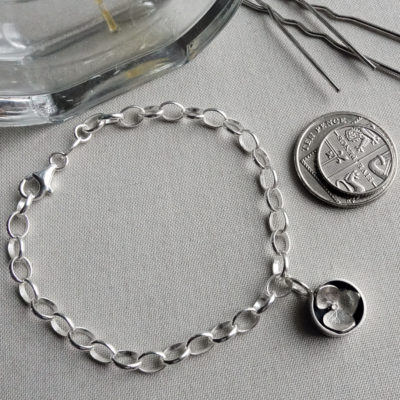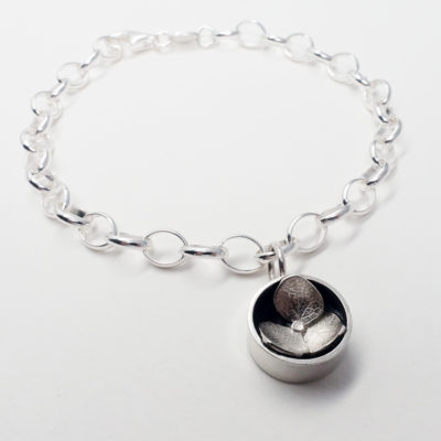 This bracelet features a single hydrangea bud. Each bud is hand fabricated using silver imprinted with dried hydrangea flowers to create a unique tiny arrangement, consequently no two bracelets will be exactly the same. The back surface of the hydrangea bud charm is imprinted with a leaf skeleton. The bracelet chain is made from sterling silver and is 18cm. The length is adjustable.