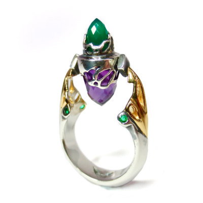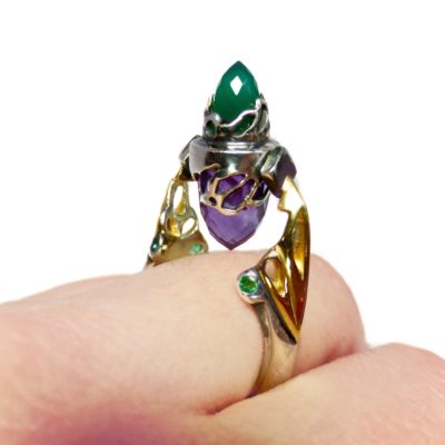 The center piece consists of a faceted bullet cut amethyst stone topped with a smaller green agate faceted bullet cut stone. The center settings are inspired by the delicacy of a butterfly wing hovering just over the skin.