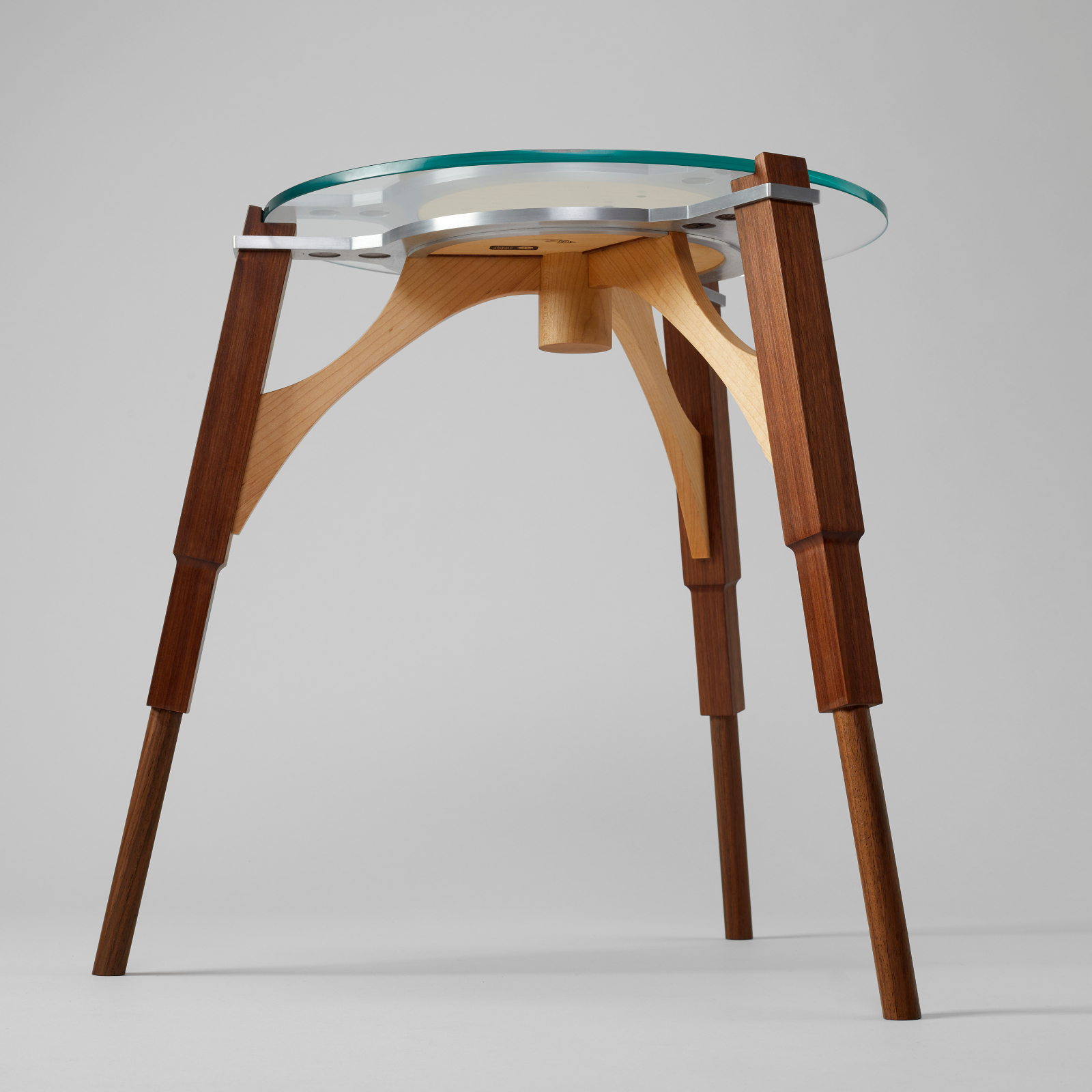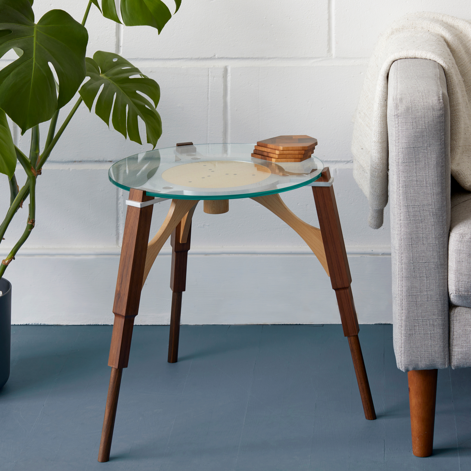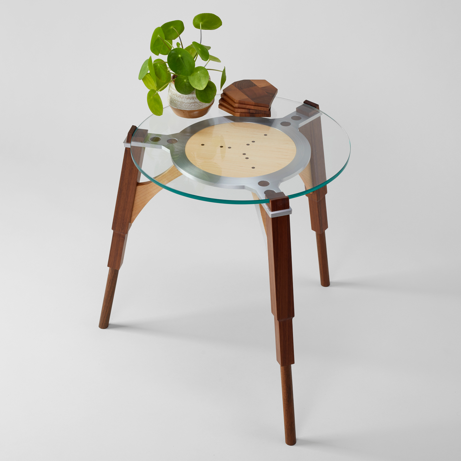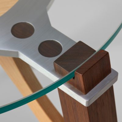 The toughened glass both widens the practical table surface, protects the timber and aluminium, and creates a layer of negative space.The aluminium has a radially brushed surface to create a soft sheen. The timbers are finished with danish oil. A striking side table for any living room.